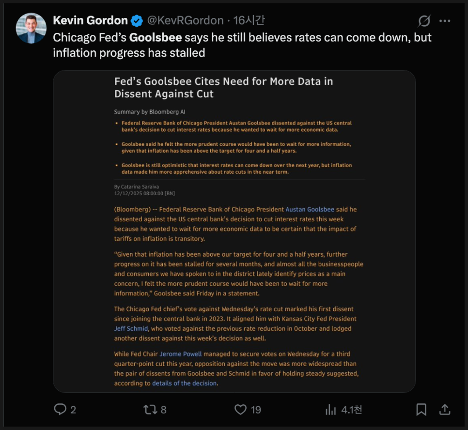 다만 시카고 연은의 오스턴 굴스비 총재는 조금 다른 목소리를 냈습니다. 그는 12월 금리 인하에도 반대했던 인물이지만, 2026년에는 오히려 시장 예상보다 더 많은 인하가 있을 수 있다고 말했습니다. 연준 내부에서도 시각이 갈리는 모습이죠.