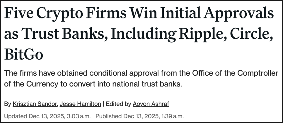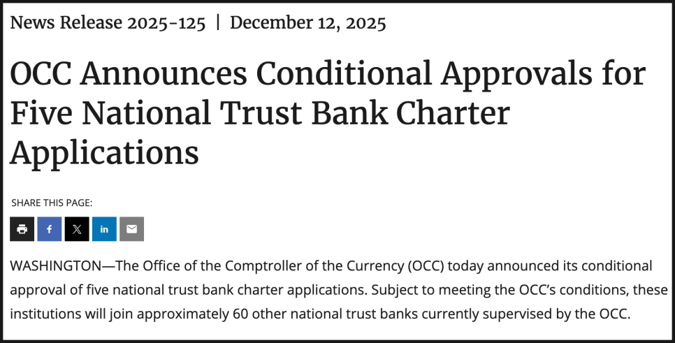 한편 미국에서는 암호화폐 기업들에게 희소식이 나왔습니다. 리플(Ripple), 서클(Circle), 비트고(BitGo), 피델리티 디지털 에셋, 팍소스(Paxos) 등 다섯 곳이 미국 통화감독청(OCC)으로부터 ‘연방 신탁은행 전환’에 대한 조건부 승인을 받은 겁니다. 쉽게 말하면, 이 기업들이 국가 차원의 공식 감독 아래 들어가는 첫 단계에 진입했다는 뜻입니다.