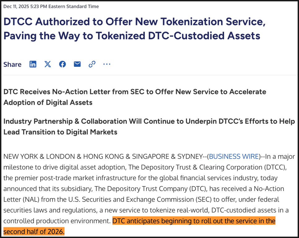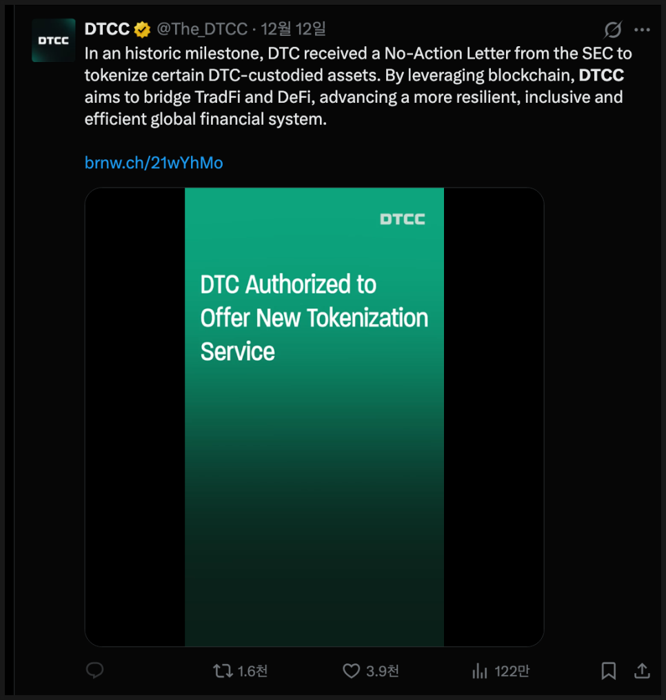 이번 승인은 세계 최대의 증권 결제 기관인 DTCC(Depository Trust & Clearing Corp.)의 자회사 DTC(Depository Trust Co.)가 신청해 받은 것인데요. DTCC는 미국 주식·ETF 결제를 거의 독점하는 인프라 기업이기 때문에, 이들의 움직임은 금융 시스템 전체의 방향을 암시하는 효과가 있습니다.