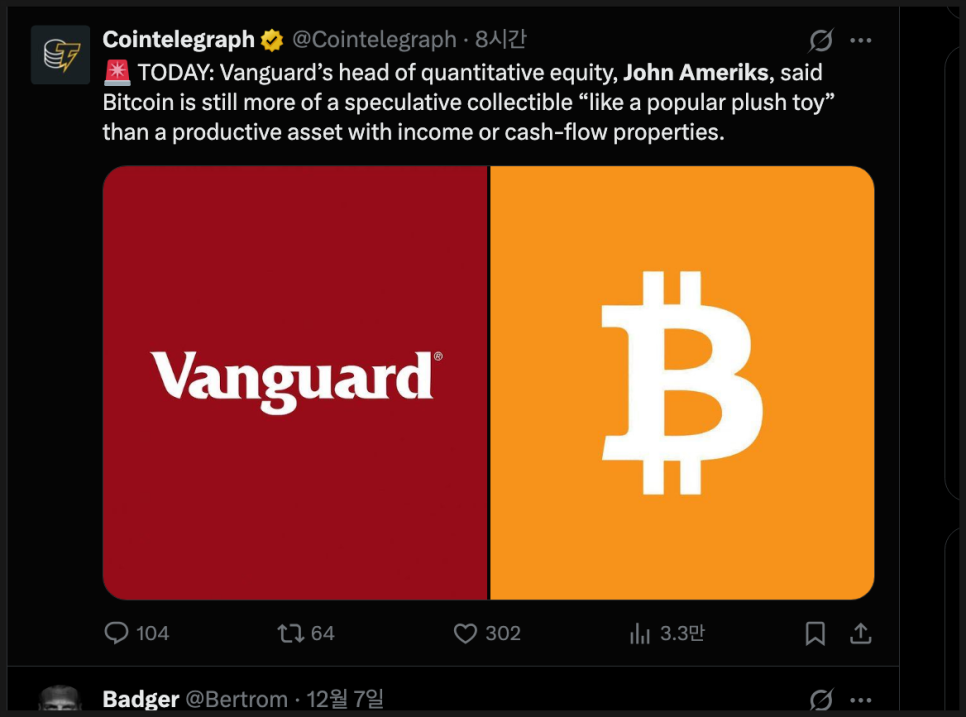 어쨌든 이번 발언은 흥미로운데요. 뱅가드가 비트코인을 품는가 싶었는데, 내부 핵심 임원은 여전히 회의적인 시각을 유지하고 있다는 점입니다. 정책 변화는 있었지만 회사의 철학 자체가 바뀐 것은 아니라는 메시지로도 해석됩니다. 코인 시장 입장에서는 메이저 기관이 보여주는 이런 ‘양면적 태도’가 앞으로 어떤 방향으로 이어질지 지켜볼 필요가 있어 보입니다.