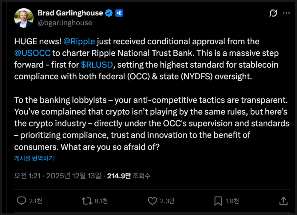 리플의 최고경영자 브래드 갈링하우스(Brad Garlinghouse)는 이번 승인을 “엄청난 진전”이라고 평가했습니다. 특히 리플이 발행하는 13억 달러 규모의 스테이블코인 RLUSD에 큰 힘이 될 것이라고 말했죠. 그는 미국 은행 로비단체가 암호화폐를 견제해 왔다며 강한 불만도 드러냈습니다.