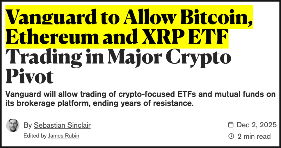 시점도 묘합니다. 뱅가드는 오랫동안 암호화폐 관련 상품을 거부해 왔지만, 지난해 비트코인 친화적인 CEO 살림 람지(Salim Ramji)가 취임한 뒤 방향을 바꿨습니다. 현재는 비트코인, 이더리움, 리플(XRP), 솔라나(Solana)가 포함된 ETF를 고객이 자유롭게 사고팔 수 있도록 플랫폼을 열었습니다. 다만, “투자 조언은 제공하지 않는다”는 점을 분명히 했습니다.