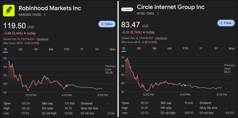 로빈후드(HOOD), 서클(CRCL) 역시 주가가 하락했습니다.