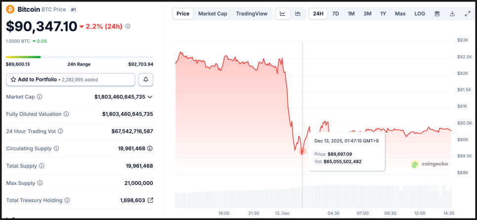 12월 12일 금요일 비트코인이 한때 9만 달러 아래로 떨어졌습니다. 최근 며칠 동안 이어진 AI 관련 불안감이 미국 기술주를 흔들었고, 그 여파가 그대로 코인 시장에도 번졌습니다.