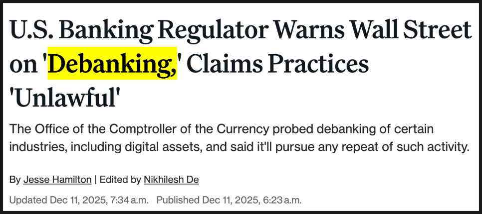 이번 승인 흐름에는 미국 은행들의 ‘디뱅킹(debanking)’ 논란도 작용했습니다. 최근 OCC는 대형 은행 9곳 모두가 합법적인 암호화폐 기업들의 계좌를 일방적으로 닫아온 사실이 있다고 보고했고, 이런 은행들은 앞으로 처벌 가능성도 있다고 발표했습니다. 업계가 오랜 기간 주장해온 불합리한 ‘배제 관행’에 대해 정부가 공식적으로 손을 보기 시작한 셈입니다.