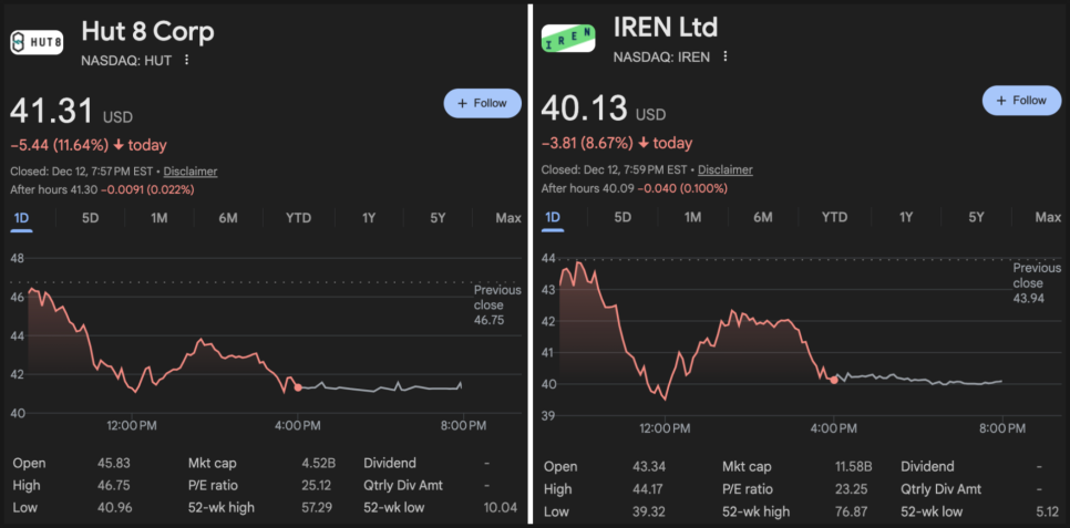 AI 사업으로 포트폴리오를 넓히던 비트코인 채굴주들도 비슷하게 흔들렸습니다. 헛8, 아이렌 같은 기업들이 10% 전후로 떨어졌고