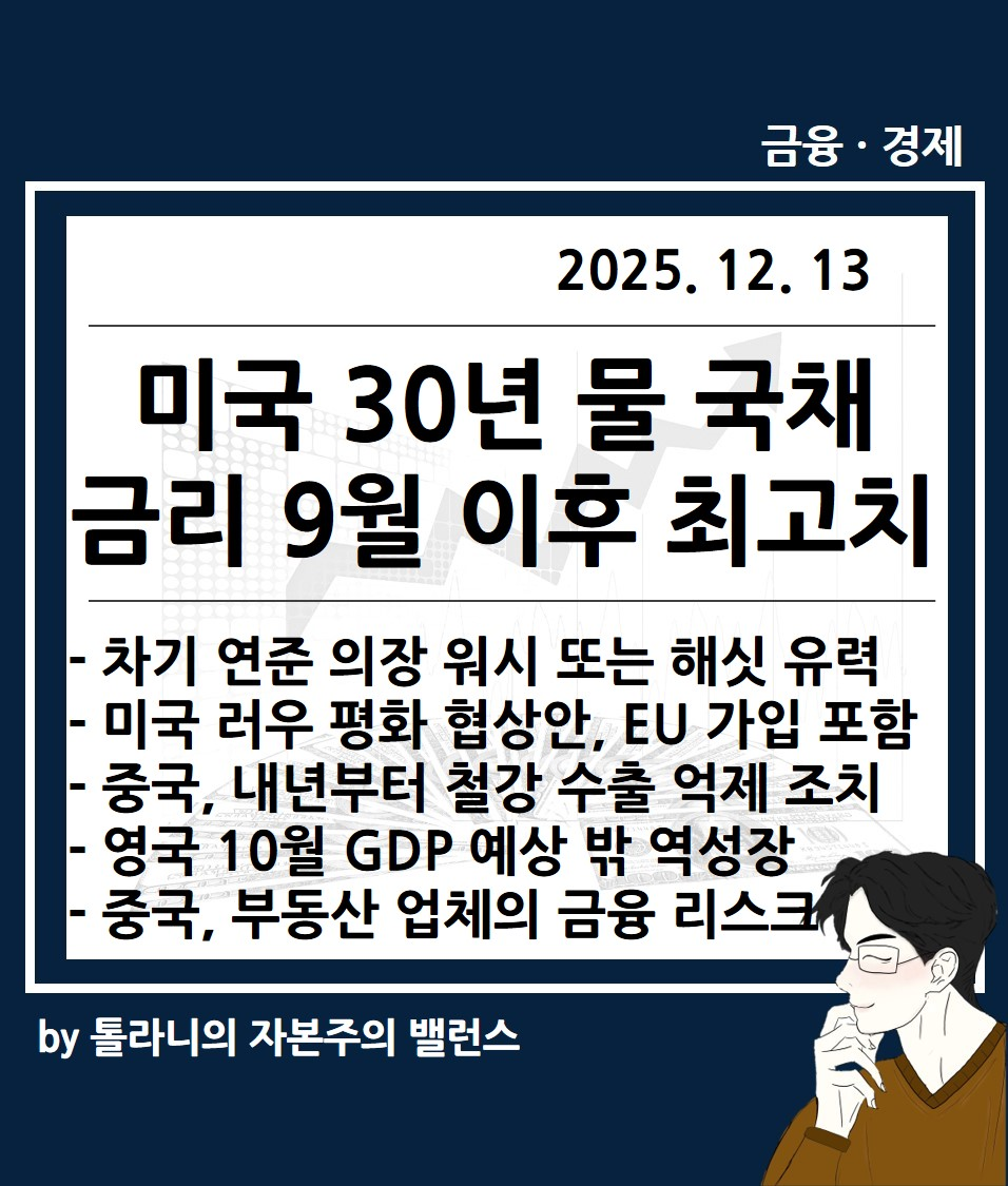 이에 ‘미국 30년물 국채금리 9월 이후 최고치, 차기 연준 의장 워시 또는 해싯 유력 등 주요 국가 경제 및 금융 동향’ 관련하여 언론 보도 및 국제금융센터 보고서를 통해 좀 더 자세히 알아보도록 하겠습니다.