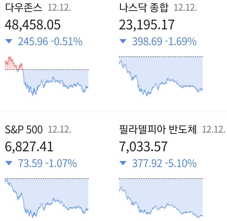 다우지수는 전일 대비 -0.51% 떨어진 48,458.05에 거래를 마쳤으며, 대형주 중심의 S&P500 지수는 전장 대비 -1.07% 하락한 6827.41에 장을 마감하였습니다. 기술주 위주의 나스닥 지수도 전 거래일 대비 -1.69% 하락한 -23.195.16에 거래를 마치며 장을 마감하였습니다.
