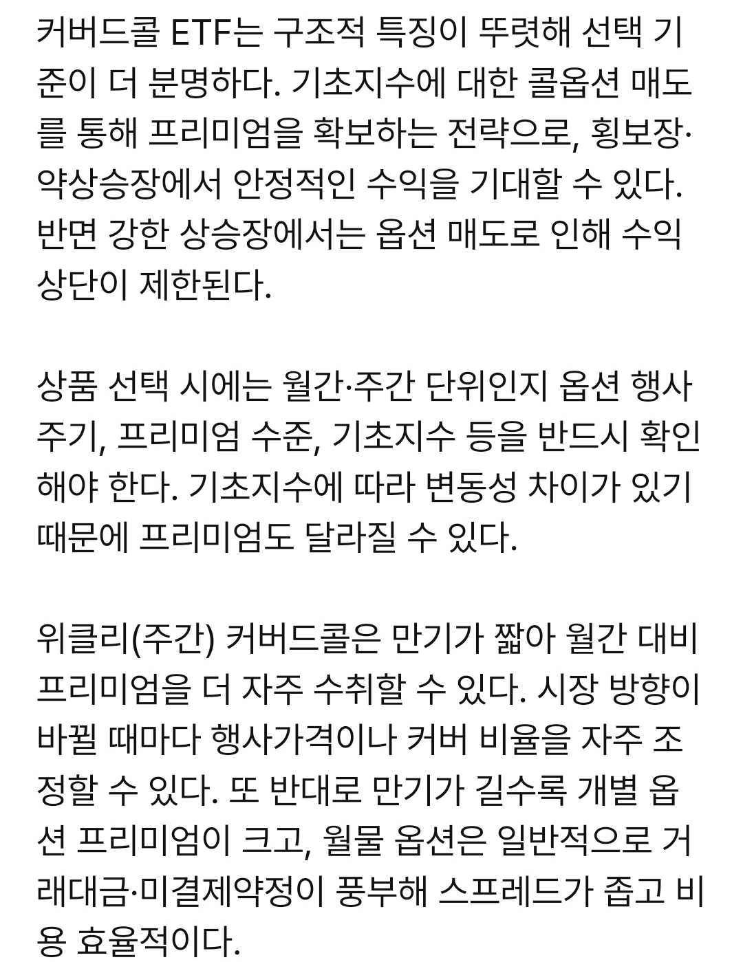 기초지수가 크게 오르는 구간에서는 일반 주식형 ETF가 더 잘 나갈 수 있고, 커버드콜은 상대적으로 수익이 제한될 가능성이 커요.