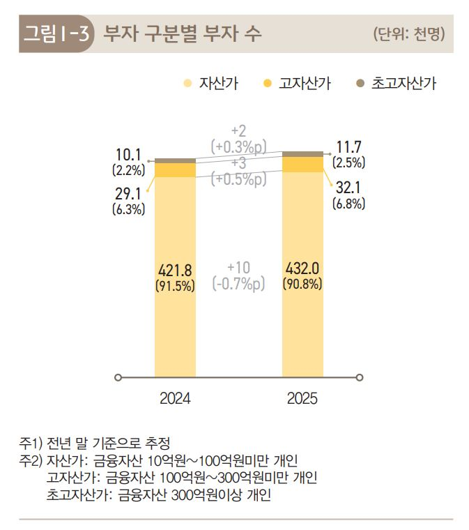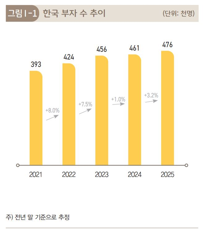 ● '한국 부자'는 금융자산 10억 원 이상을 보유한 개인으로, 2025년 47만 6천 명으로 추정된다. 이는 전년 46만 1천 명 대비 1만 4천 9백 명 증가한 수준이며, 전체 인구에서 부자의 비중은 0.93%로 전년 대비 0.03%P 상승했다.