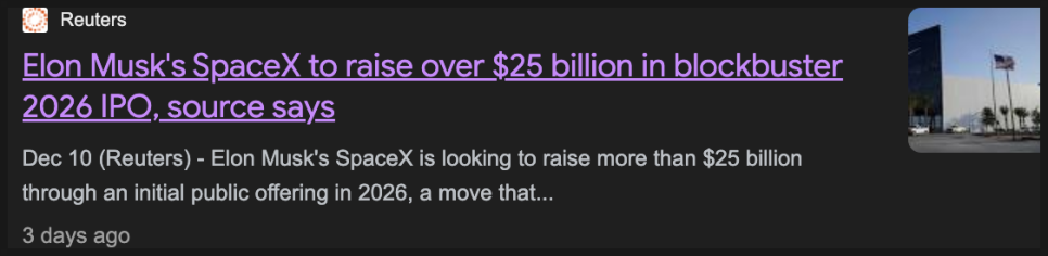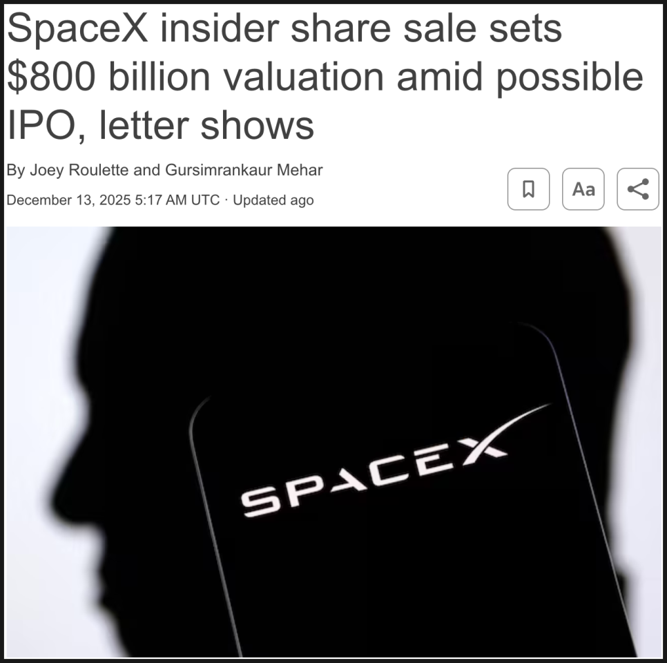 회사의 내부 평가 역시 상장 준비의 흐름을 보여주고 있습니다. 최고재무책임자 브렛 존슨(Bret Johnsen)은 최근 내부 서한에서 스페이스엑스의 기업가치를 약 8천억 달러로 산정하며, 주당 421달러 기준으로 25억 달러 규모의 2차 거래(세컨더리)를 진행하겠다는 계획을 전했습니다. 이런 내부 거래는 상장 시 예상 주가와 기업가치의 기준 역할을 하는데요. 투자자 입장에서는 상장 후 가격대를 가늠할 수 있는 중요한 지표가 됩니다.