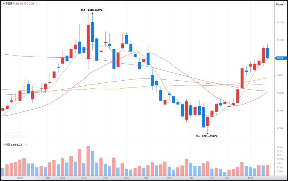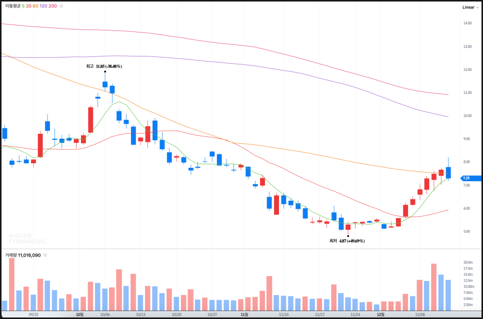 일봉에서는 단기 흐름이 가장 뚜렷하게 개선되고 있습니다. 11월 후반 4달러대 저점을 찍은 뒤 5일선과 20일선을 차례로 돌파하며 단기 상승 흐름이 형성됐습니다. 최근에는 60일선 근처에서 저항을 받았지만, 이전처럼 바로 무너지지 않고 되돌림 구간을 만들며 힘을 유지하는 모습입니다. 반등 과정에서 거래량이 증가한 것도 매수세가 유입되고 있다는 신호로 보입니다.