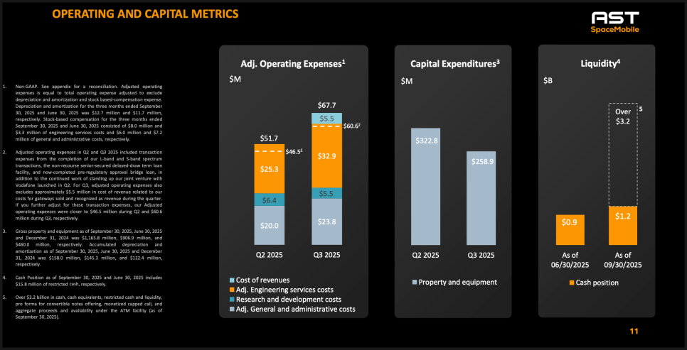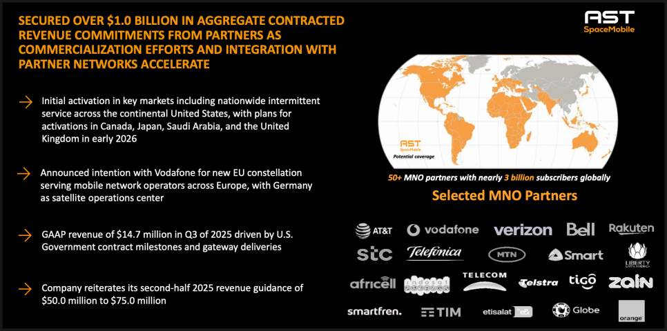 물론 대규모 위성군 구축과 네트워크 상용화는 막대한 자본이 필요한 사업입니다. 초기 투자와 운영 비용이 크기 때문에 시장에서는 일정과 자금 조달 능력에 대한 우려도 존재합니다. 그러나 최근 실적 발표에서 AST가 현금을 30억 달러 이상 확보했고, 핵심 상업 파트너로부터 10억 달러 이상의 계약 약정을 확보했다고 밝힌 점은 사업 안정성과 실행력 측면에서 의미 있는 진전으로 볼 수 있습니다.