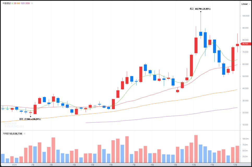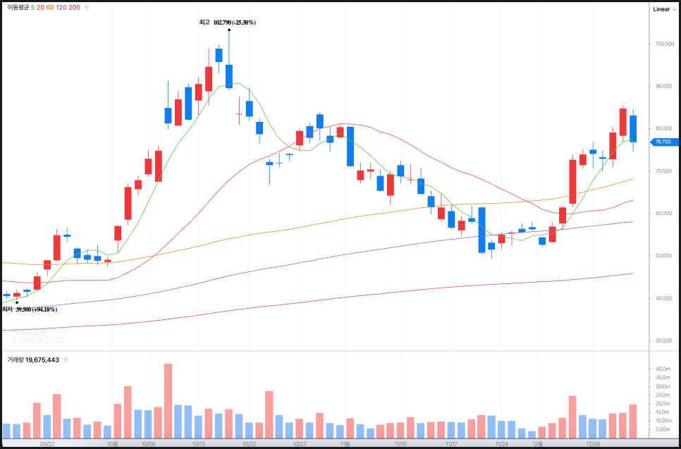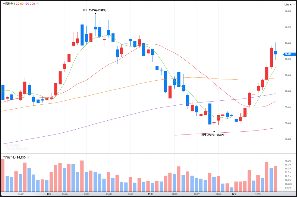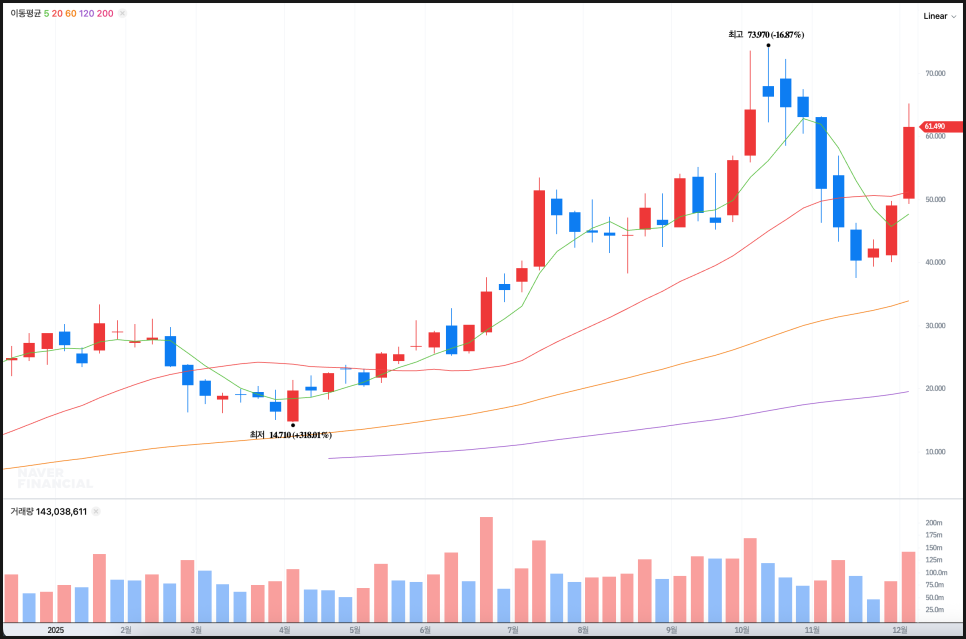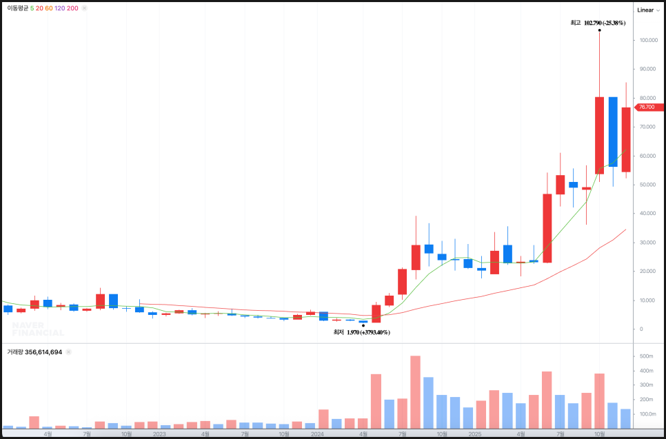 주봉에서는 상승과 조정이 비교적 뚜렷하게 구분됩니다. 10월 고점 이후 계속 눌리면서 중기 이동평균 아래로 떨어졌지만, 최근에는 다시 반등해 20주선과 5주선 위로 올라왔습니다. 강한 변동성이 반복되는 종목이라 주별로 흐름이 크게 바뀌지만, 지난 몇 주 동안 거래량이 다시 붙고 있다는 점은 단기 심리가 조금씩 회복되고 있음을 보여줍니다.