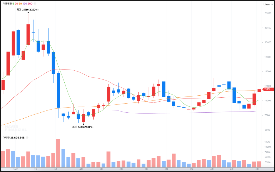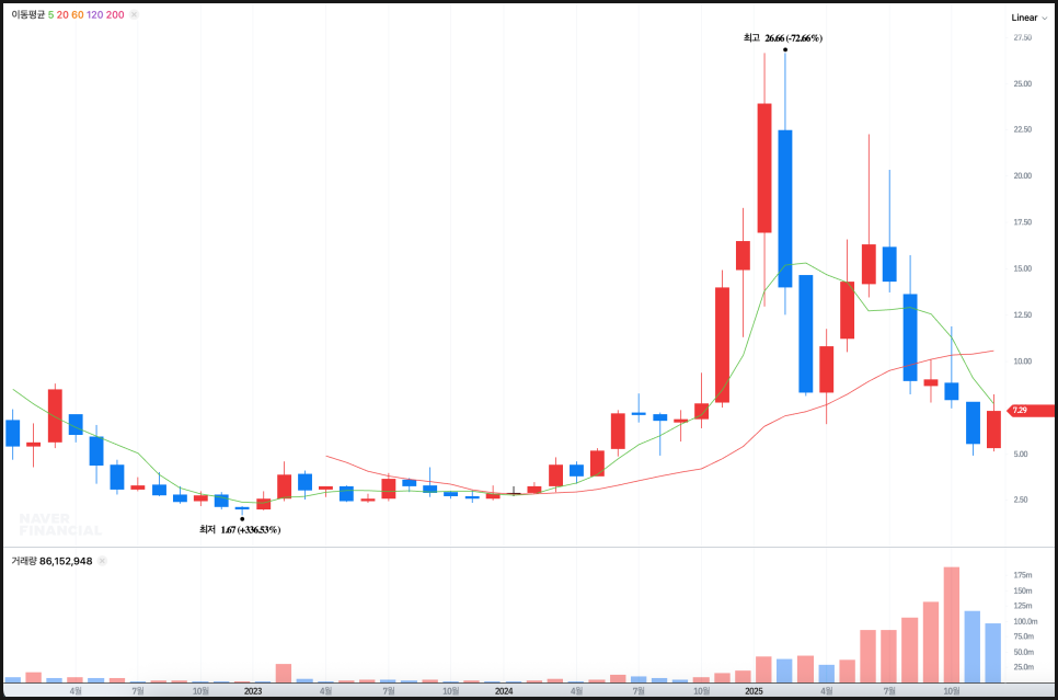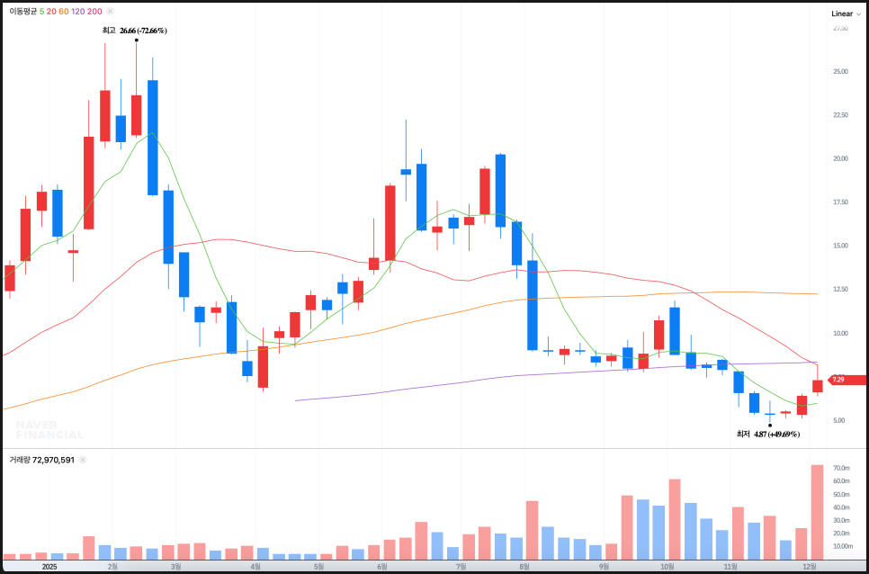 주봉입니다. 고점을 찍은 뒤 몇 달 동안 저점을 지속적으로 낮춰 왔고, 4달러대까지 하락했다가 최근 몇 주 동안 강한 반등이 나왔습니다. 특히 거래량이 점차 늘어나면서 단기 이동평균선을 회복했고, 20주선 부근에서 크게 밀리지 않고 버티는 흐름도 확인됩니다. 아직 60주선과 120주선 등 중장기선들이 모두 위에서 눌러오는 구조라 완전한 추세 전환은 아니지만, 하락 압력이 분명히 약해졌다는 점은 의미가 있습니다.