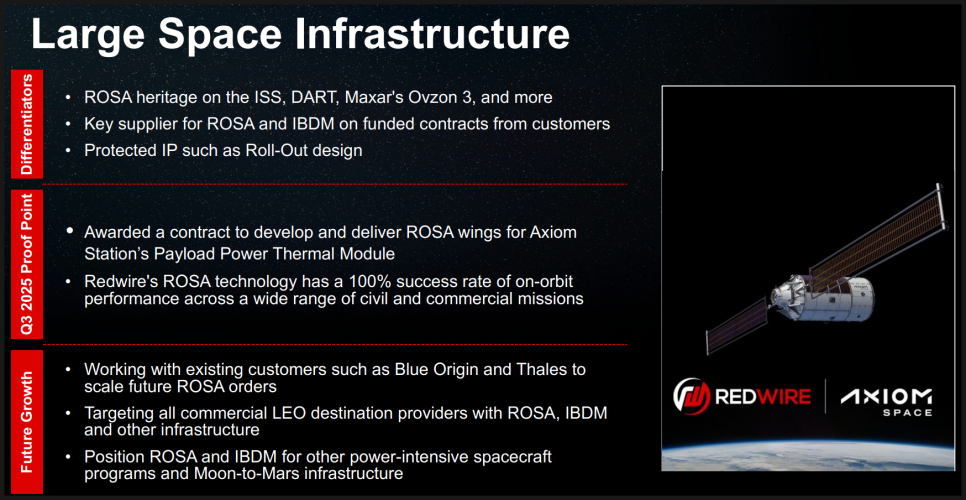 두 번째는 ROSA라는 접이식 태양광 패널과 도킹 시스템처럼 우주 정거장과 달·화성 탐사에 들어가는 대형 인프라입니다. 국제우주정거장에서 성능을 입증한 뒤, 액시엄(Axiom)의 상업용 우주정거장 등으로 계약을 넓혀 가는 그림이라 검증된 기술로 수주가 따라올 가능성이 기대되는 분야입니다.