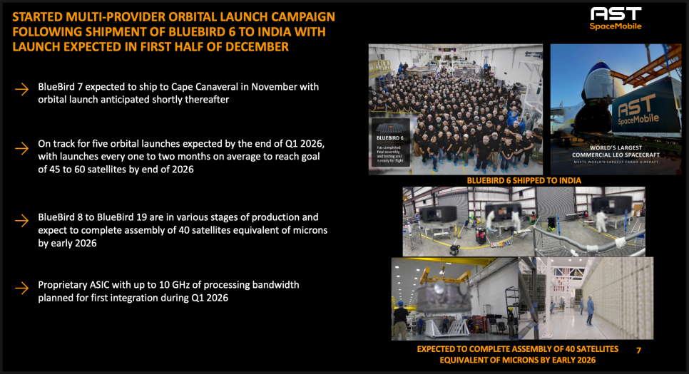 기술 개발 측면에서도 진전이 이어지고 있습니다. AST는 위성 기술 시연을 통해 일반 스마트폰으로 음성 통화, 영상 통화, LTE 데이터 사용까지 성공적으로 구현했고, 실제 상용 서비스 론칭을 향한 중요한 기술적 이정표로 평가됩니다. 제조와 발사 측면에서도 일정이 가시화돼, 2025년 말부터 블루버드(BlueBird) 위성 발사를 시작하며 2026년까지 45~60기 수준의 위성군 구축을 목표로 하고 있습니다.