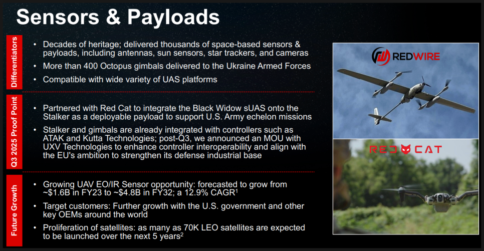 마지막은 센서·페이로드 사업입니다. 예전부터 위성용 카메라, 태양·별 센서 등으로 레거시를 쌓아 왔고, 최근에는 무인기에 들어가는 전자광학/적외선 짐벌(EO/IR gimbal)까지 공급 범위를 넓혔습니다. 특정 플랫폼에만 묶이지 않고 여러 기체에 쓸 수 있는 제품이라, 위성 수 증가와 UAS 시장 성장의 양쪽을 모두 타는 구조를 만들겠다는 방향성이 뚜렷합니다.
