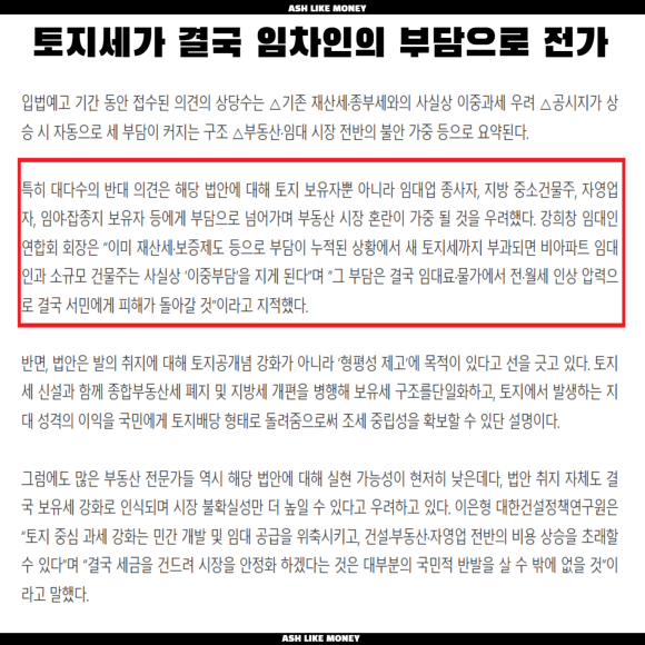 현재 발의된 토지세 법안은 과거 국토보유세와 일맥상통한 법안으로 세금으로 집값을 잡겠다는 것이다. 말은 부동산 불로소득을 때려잡겠다고 하지만 결국 세금을 더 걷어들이는 것이다. 그에 따라 확보된 세금은 또 다시 돈 뿌리기에 쓰일 것이다. 지지층들은 튼튼하게 다지면서 화폐가치를 계속 떨어뜨리고 그에 따라 정부가 발행한 국채 가치도 낮추는 효과를 낼 것으로 보인다.