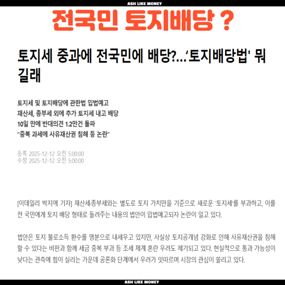 또 어이가 없는 법안을 발의하여 국민들을 못 살게 굴기 시작했다. 종부세라는 징벌적 세금이 있음에도 불구하고 재산세(토지분 + 건물분 포함), 종부세와는 별도의 또 다른 토지배당에 대한 세금법안이 발의된 것이다. 토지 가치만을 기준으로 새로운 "토지세"를 부과하는 것인데 이를 전 국민에게 토지배당 형태로 돌려준다는 내용이다. 사유재산이 인정되는 대한민국에서 이러한 법안은 마치 과거 캄보디아 독재자가 자국민을 위한답시고 토지를 많이 보유하는 지주들의 토지를 뺏는 것과 다름 없는 것이다.
