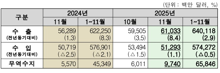 ○ 11월 수출은 전년 동월 대비 8.4% 증가한 610억 달러로, 6개월 연속 증가하였다.