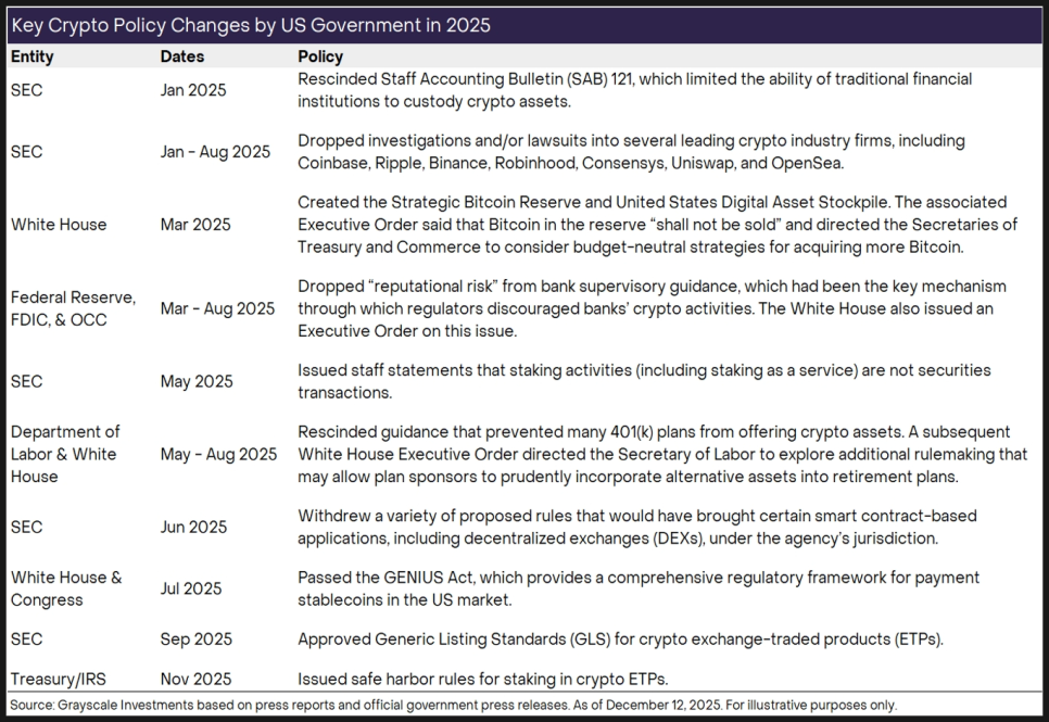 두 번째는 규제입니다. 그레이스케일은 최근 몇 년간 이어진 규제 불확실성이 빠르게 정리되고 있다고 봅니다. 현물 기반 크립토 ETF 승인, 스테이블코인을 제도권으로 편입한 GENIUS 법안, 그리고 2026년을 목표로 논의 중인 미국의 초당적 크립토 시장 구조 법안 등이 기관 자금을 끌어들이는 결정적인 계기가 되고 있다는 거죠. 기관 입장에서는 규제가 명확해질수록 투자, 보관, 온체인 활용이 훨씬 쉬워집니다.