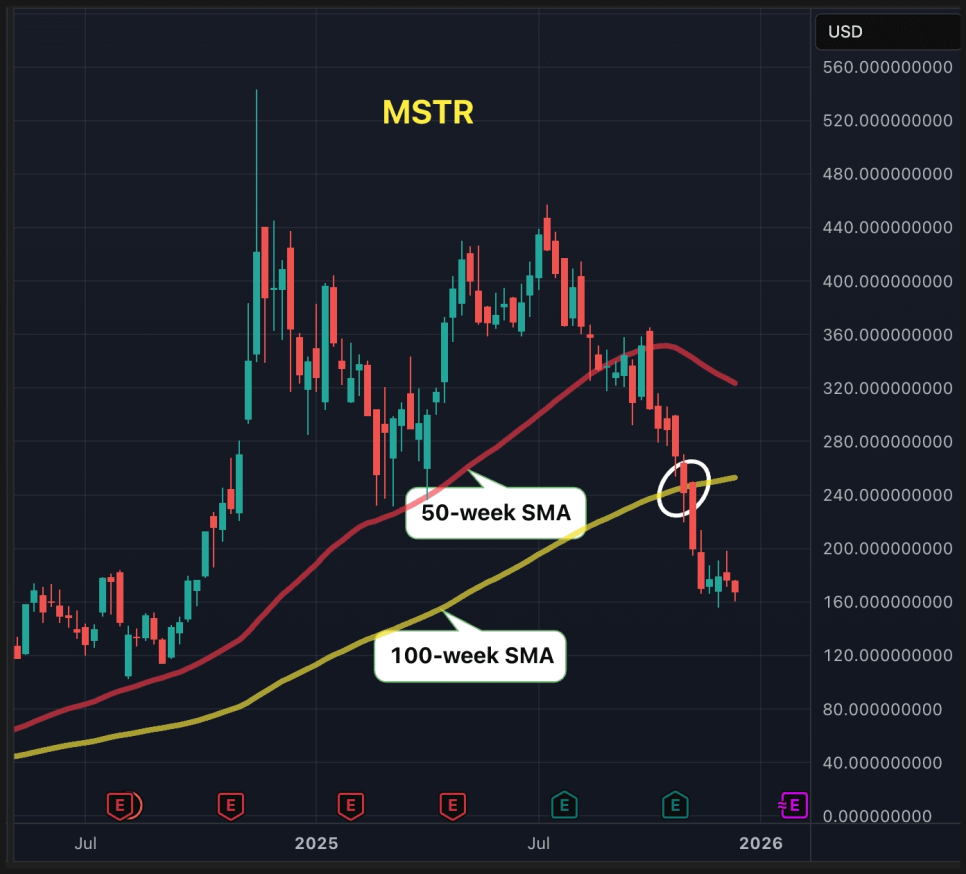 실제로 이런 흐름을 먼저 보여준 사례가 바로 스트래티지입니다. 이 회사 주가는 11월 초 100주 이동평균선을 밑으로 뚫고 내려갔고, 당시 220달러 수준까지 떨어졌습니다. 이후 매도세가 이어지면서 현재는 160달러 선까지 밀린 상태인데요. 연초 고점이었던 457달러와 비교하면 60% 넘게 하락한 셈입니다.