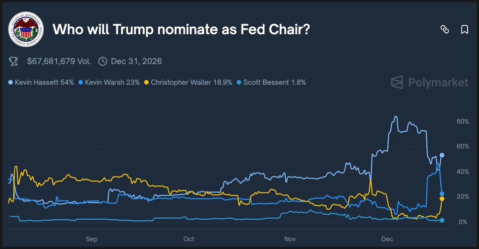 탈중앙 예측 플랫폼 폴리마켓 기준으로 보면, 현재 월러가 차기 연준 의장으로 지명될 확률은 약 19% 수준입니다. 해싯이 54%, 워시가 23%로 더 앞서 있는 상황이죠. 다만 해싯의 경우 유력 후보로 꼽히면서도, 트럼프 측 핵심 인사들로부터 내부 반발을 겪고 있다는 보도도 함께 나왔습니다.