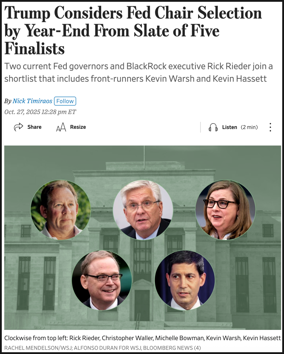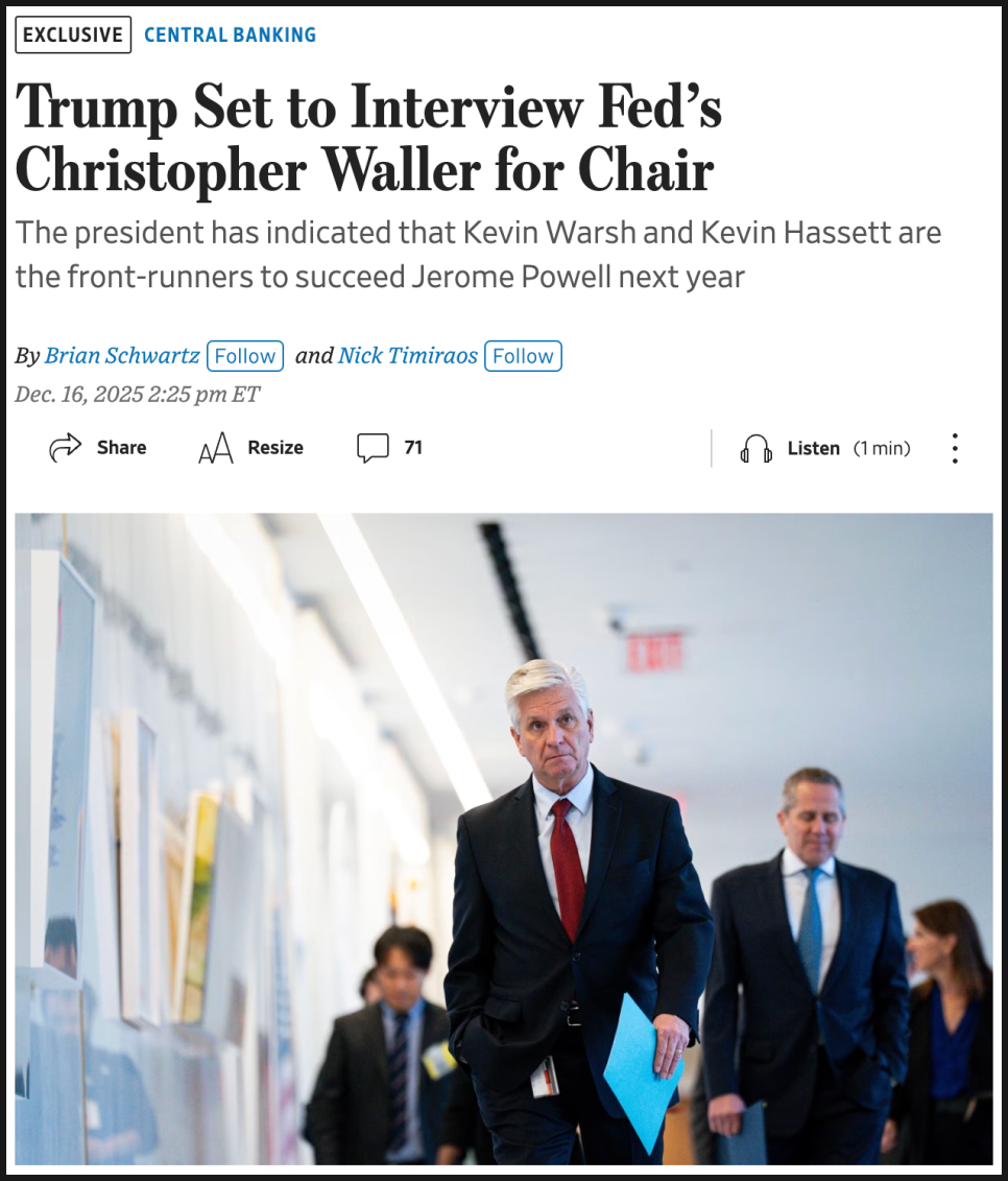 흥미로운 점은 월러가 연준 내부에서 가장 적극적으로 금리 인하를 주장해 온 인물로 평가받고 있다는 점입니다. 월스트리트저널은 월러가 최근 연준의 금리 인하 결정에 대해 논리적으로 설득력 있는 설명을 내놓았고, 연준 내 의견 차이를 조율할 수 있는 인물로 월가의 평가도 나쁘지 않다고 전했습니다. 다만 트럼프와의 개인적인 친분이 상대적으로 약하다는 점 때문에 여전히 ‘언더독’으로 분류된다는 분석도 함께 나옵니다.