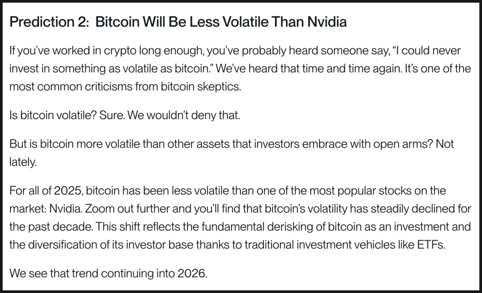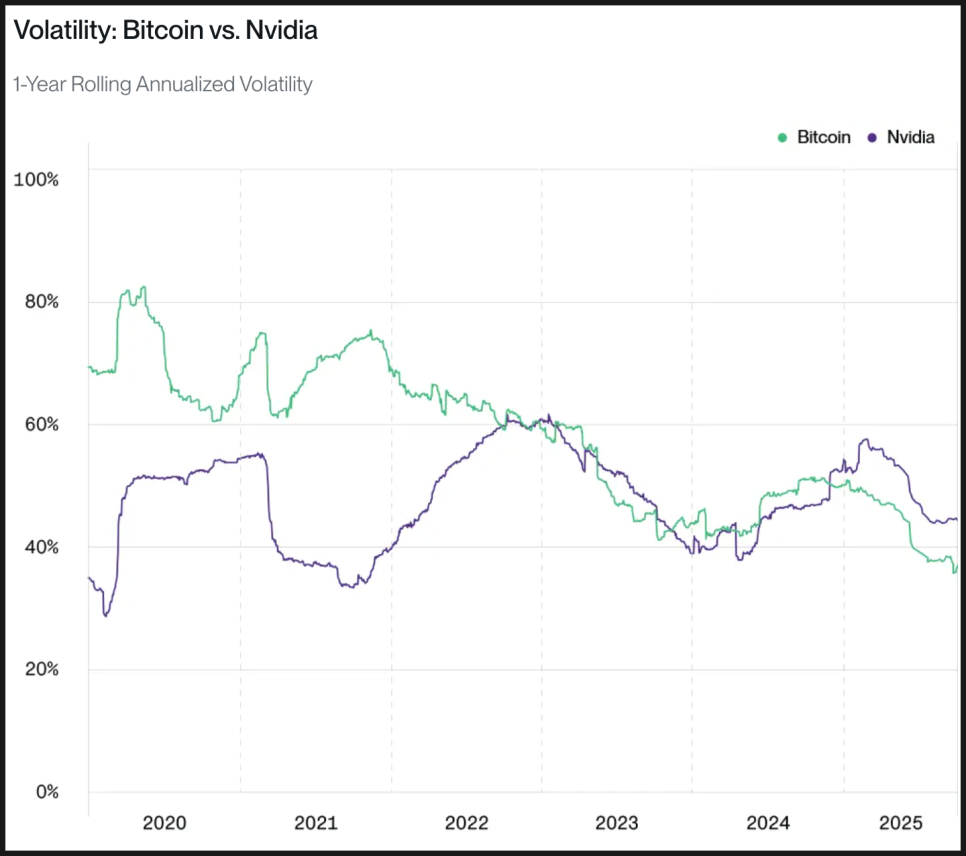 더 나아가, 변동성이 큰 자산으로 알려진 비트코인이 오히려 엔비디아 같은 대표적인 AI 주식보다 변동성이 낮아질 수 있다는 꽤 공격적인 전망도 내놨습니다.