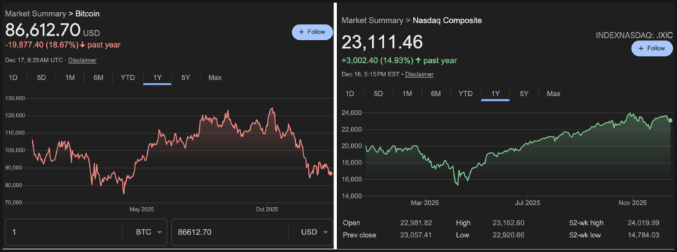 참고로 현재 비트코인 가격은 약 8만7천 달러 수준인데요. 고점 대비로 보면 여전히 30% 이상 내려와 있는 상태입니다. 흥미로운 건 지난 1년 기준으로 보면 비트코인이 오히려 약 18% 하락했다는 점입니다. 같은 기간 나스닥이나 S&P500 같은 미국 주식 지수는 두 자릿수 상승을 기록했죠.