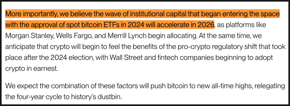 한편 비트와이즈는 2026년에 비트코인이 다시 한 번 사상 최고가를 찍고, ‘4년 주기설’이 사실상 끝날 수 있다고 전망했습니다. 최근 두 달간 가격이 지지부진했음에도 불구하고, 흐름 자체는 여전히 상방을 보고 있다는 판단이죠.