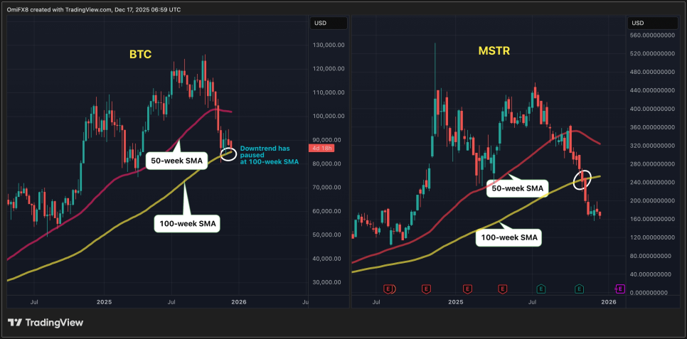 이게 왜 중요하냐면, 스트래티지가 과거에도 비트코인보다 먼저 움직인 적이 있었기 때문입니다. 앞서 50주 이동평균선을 깰 때도 스트래티지가 먼저 무너졌고, 이후 비트코인이 뒤따랐던 전례가 있죠.