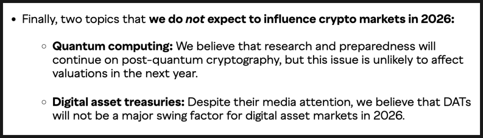 반대로 그레이스케일이 2026년에 큰 영향을 주지 않을 것으로 본 요소도 있습니다. 양자컴퓨터는 당분간 블록체인 보안이나 자산 가치에 실질적인 위협이 되지 않을 것으로 봤고요. 2025년에 많이 주목받았던 디지털 자산 트레저리(DAT) 전략 역시, 내년에는 새로운 수요를 크게 만들거나 시장을 흔들 만한 변수는 아니라고 선을 그었습니다.