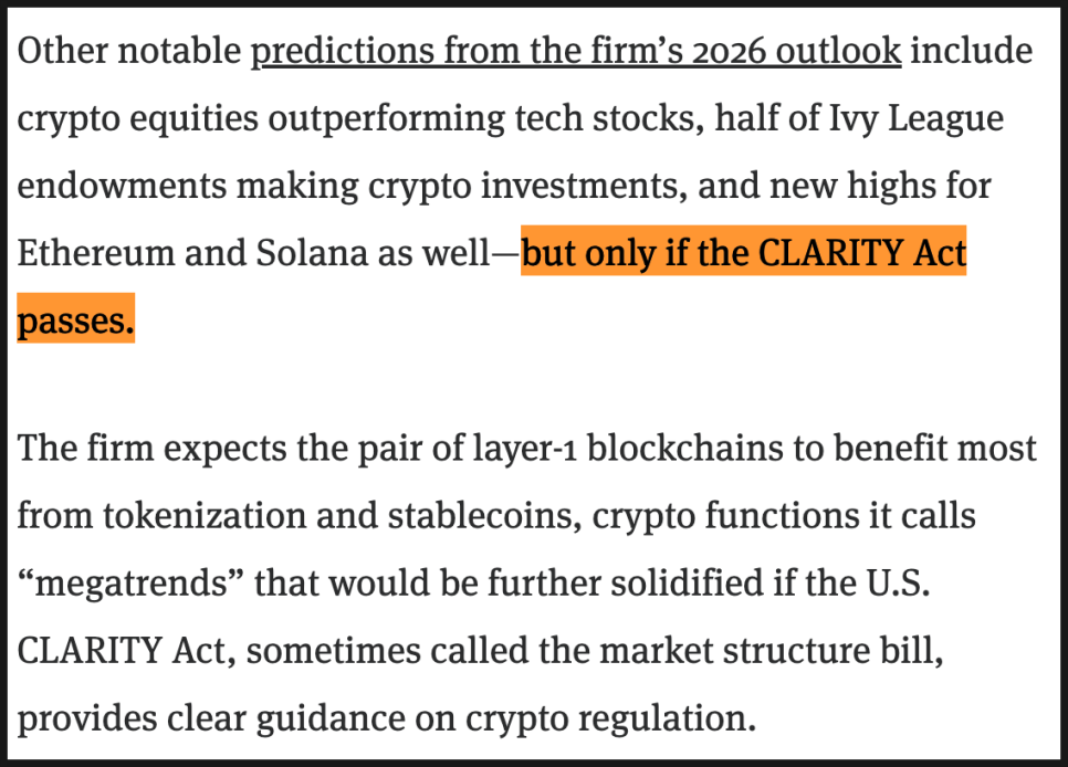 다만 이 보고서가 전제하고 있는 조건도 분명합니다. 이더리움과 솔라나가 2026년에 나란히 사상 최고가를 경신할 수 있다는 전망 역시, 미국에서 이른바 시장 구조 법안으로 불리는 클래리티 법 CLARITY Act가 통과된다는 가정이 붙어 있습니다. 이 법안이 통과돼야 스테이블코인과 자산 토큰화 같은 흐름이 본격적으로 커질 수 있고, 그 수혜를 레이어1 블록체인들이 받을 수 있다는 논리입니다.