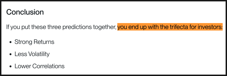 이 모든 요소를 종합하면 투자자 입장에서는 세 가지가 동시에 충족될 수 있다고 주장합니다. 수익률은 높아지고, 변동성은 낮아지며, 주식 시장과의 연동성도 줄어드는 조합이라는 거죠. 비트와이즈가 말하는 일종의 ‘트리플 조합’입니다.