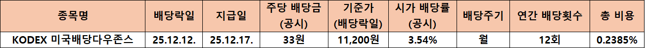 KODEX 미국배당다우존스는 국내에서 ‘한국판 SCHD’로 불리며 지난해까지 상당한 인기를 끌었던 월배당 ETF입니다. 12월 기준 주당 배당금은 공시 기준 33원으로 확인되었고 배당락일은 12월 12일 지급일은 12월 17일이었습니다. 배당락일 기준가는 11,200원으로 집계되며 시가 배당률은 3.54% 수준을 기록했습니다.