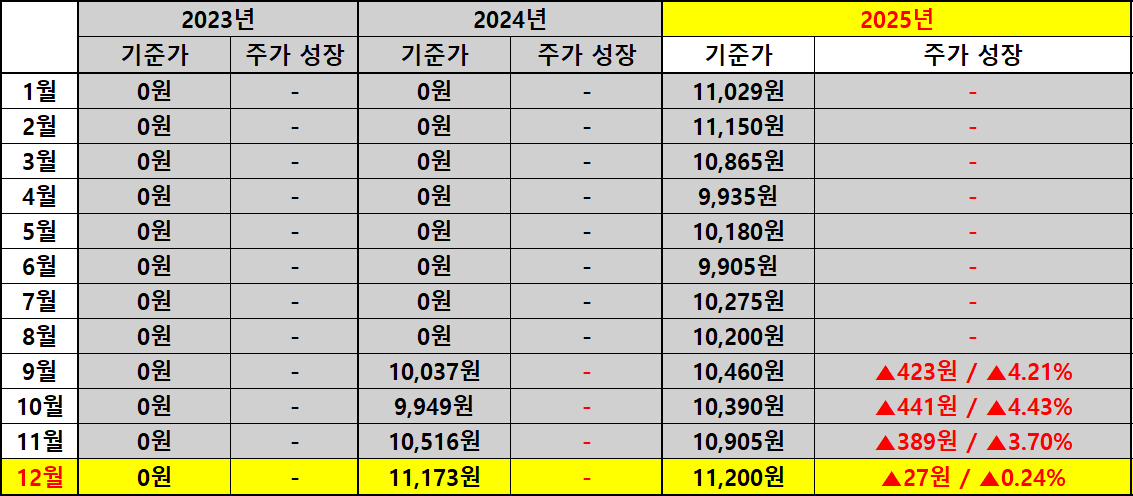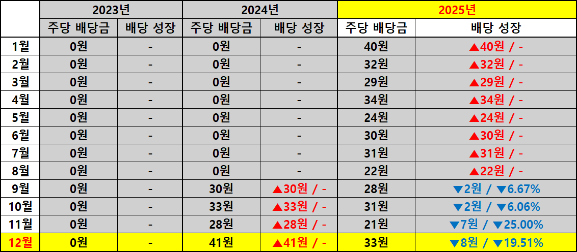 지난해 12월 주당 배당금이 41원이었던 것과 비교하면 올해 12월 배당금은 33원으로 8원 감소했습니다. 전년 동기 대비 배당 성장률은 -19.51%로 집계되며 수치상으로는 분명한 후퇴입니다. 반면 주가는 지난해 배당락일 종가 11,173원에서 올해 11,200원으로 27원 상승하며 0.24%의 미미한 증가에 그쳤습니다.