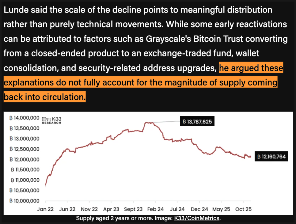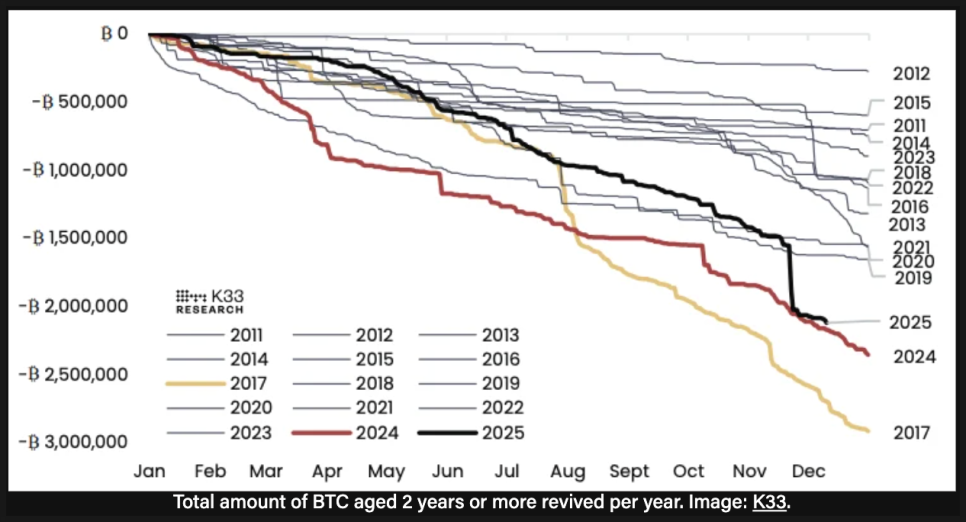 K33의 리서치 총괄 베틀레 룬데는 12월 16일 보고서에서, 2년 이상 움직이지 않던 비트코인 물량이 2024년 이후 꾸준히 줄어들고 있다고 설명했습니다. 이 기간 동안 다시 시장에 나온 비트코인은 약 160만 개로, 현재 가격 기준으로는 1,380억 달러 규모에 달합니다. 쉽게 말해, 초기에 비트코인을 보유하던 투자자들이 상당 기간에 걸쳐 실제 매도를 진행해 왔다는 뜻이죠.