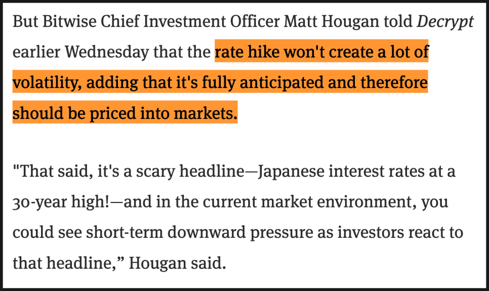 다만 비트와이즈의 최고투자책임자 매트 하우건은 조금 다른 시각을 내놨습니다. 일본은행의 금리 인상은 이미 시장에 충분히 알려진 이슈라서, 실제 변동성은 크지 않을 수 있다는 설명인데요. 다만 일본 금리가 30년 만에 최고치라는 헤드라인 자체가 워낙 자극적이다 보니, 현재처럼 예민한 시장에서는 단기적으로 추가 하락 압력이 나올 가능성은 있다고 덧붙였습니다.