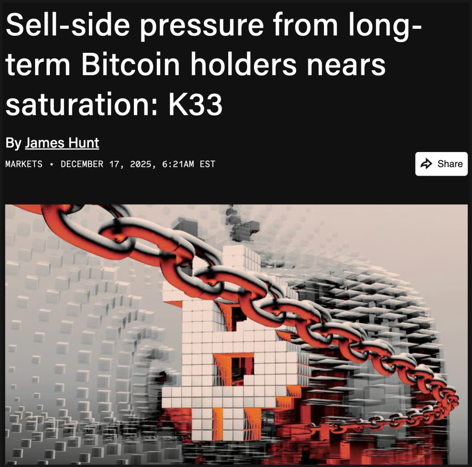 비트코인을 오래 들고 있던 투자자들의 매도세가 이제는 포화 상태에 가까워지고 있다는 분석이 나왔습니다. 리서치 및 브로커리지 업체 K33의 보고서 내용인데요. 핵심은 지난 몇 년간 이어진 장기 보유자들의 물량 출회가 거의 한 사이클을 마무리하고 있다는 점입니다.