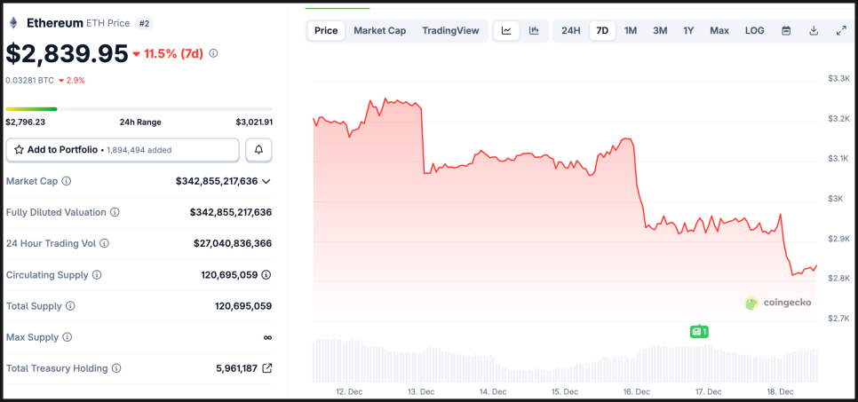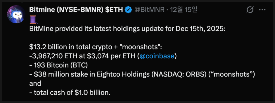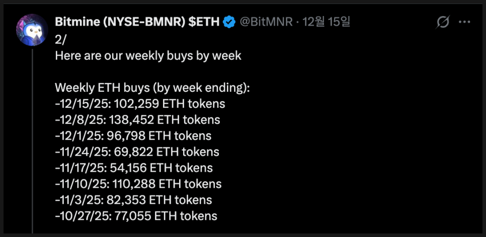 특히 눈에 띄는 부분은 시장이 약세를 보이는 상황에서도 매수를 멈추지 않았다는 점입니다. 비트마인은 12월 들어 첫 2주 동안에만 24만 개가 넘는 이더리움을 추가로 사들인 것으로 알려졌습니다.