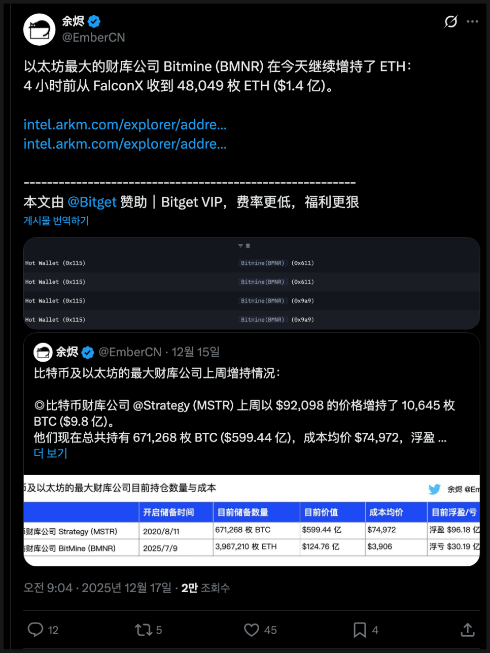 온체인 데이터 분석업체 아캄 자료를 인용해 EmberCN과 루컨체인은 비트마인이 팔콘엑스의 핫월렛에서 4만8천여 개의 이더리움을 매수했다고 분석했는데요. 다만 이 거래는 아직 회사 측에서 공식 확인한 내용은 아닙니다.