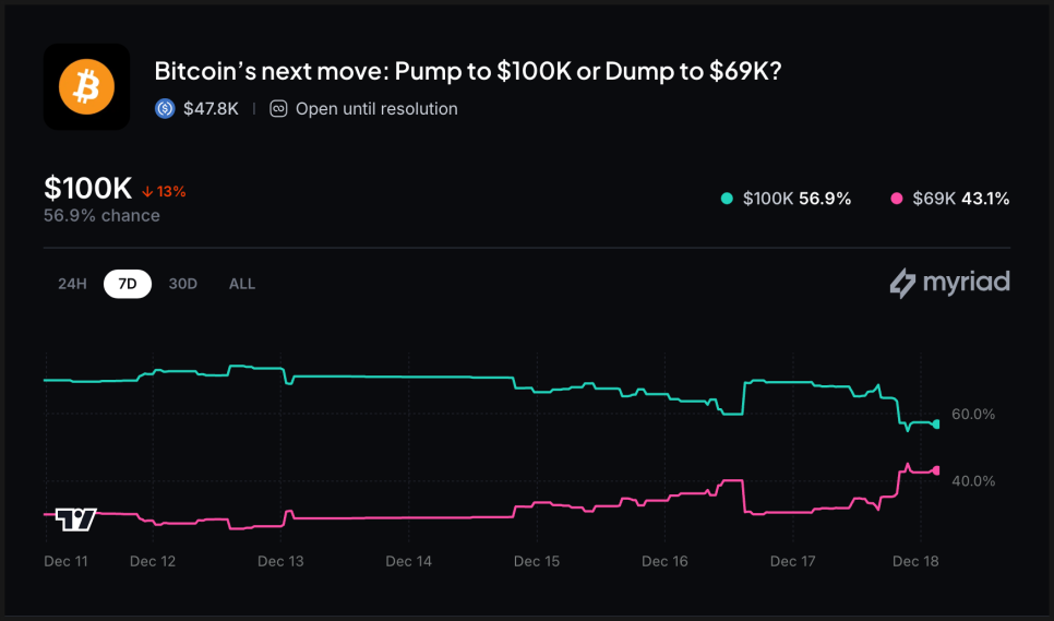 예측 시장 플랫폼인 마이리드에서도 분위기는 차게 식어버렸습니다. 비트코인이 6만9천 달러까지 내려가기 전에 10만 달러를 다시 찍을 가능성에 대해, 불과 하루 전만 해도 확률을 69퍼센트로 봤는데요. 현재는 57퍼센트 수준까지 내려왔습니다. 연말 산타랠리 자체의 가능성은 4퍼센트도 안 된다는 응답이 나올 정도죠.