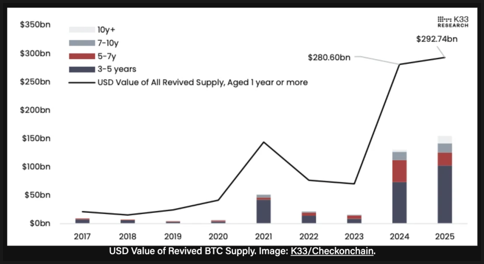 보고서는 2024년과 2025년이 비트코인 역사상 장기 보유 물량이 두 번째, 세 번째로 많이 재유통된 해라고 짚었습니다. 그보다 더 컸던 해는 2017년뿐이었는데요. 당시에는 알트코인 트레이딩, ICO 참여, 각종 프로토콜 인센티브가 주된 배경이었습니다. 반면 이번 사이클은 성격이 다르다는 게 K33의 판단입니다.
