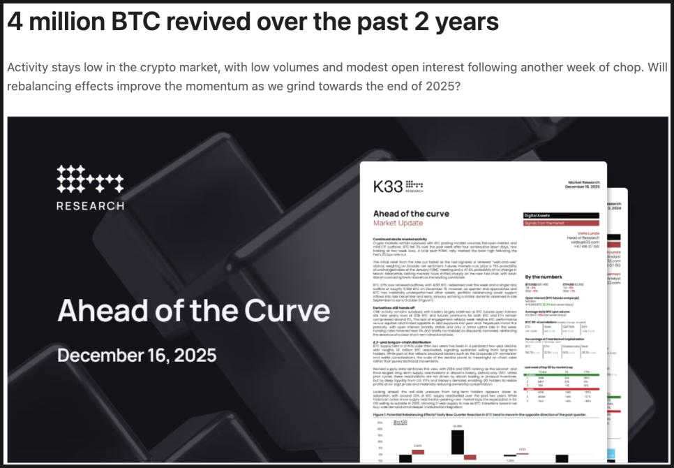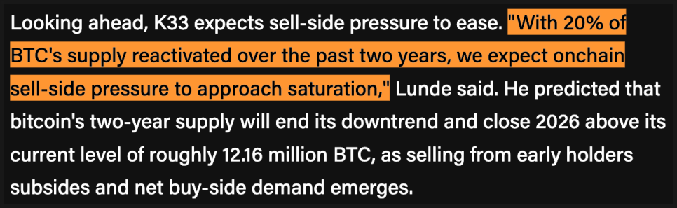 앞으로의 전망에 대해 K33는 비교적 차분한 톤을 유지했습니다. 지난 2년 동안 전체 공급량의 약 20퍼센트가 재유통된 만큼, 온체인 기준 매도 압력은 점점 약해질 가능성이 크다는 겁니다. 룬데는 2년 이상 된 비트코인 공급량이 하락세를 멈추고, 2026년 말에는 현재 약 1,216만 BTC보다 높은 수준에서 마무리될 것으로 예상했습니다. 초기 보유자들의 매도가 잦아들고, 순매수 수요가 다시 나타날 수 있다는 얘기죠.