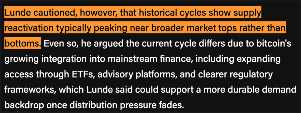 다만 룬데는 주의할 점도 분명히 했습니다. 역사적으로 보면, 공급 재유통은 바닥보다는 시장 고점 근처에서 정점을 찍는 경우가 많았다는 점입니다. 그럼에도 불구하고 이번 사이클은 ETF, 자문 플랫폼, 규제 환경 정비 등으로 비트코인이 기존 금융 시스템 안으로 훨씬 깊게 들어와 있다는 점에서 과거와는 다를 수 있다고 봤습니다. 매도 압력이 잦아든 이후에는 이전보다 더 안정적인 수요 기반이 형성될 가능성이 있다는 의미죠.