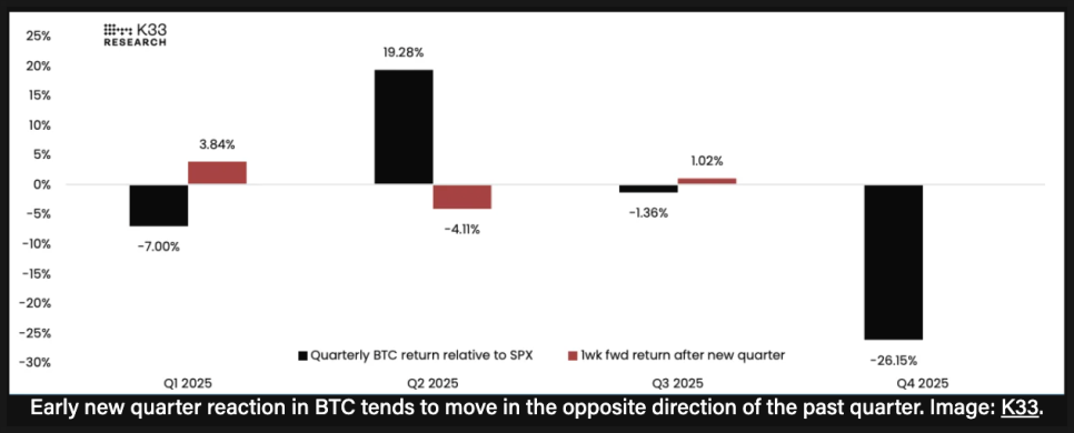 또 하나 흥미로운 포인트는 분기 말 리밸런싱 효과입니다. 비트코인은 과거에도 한 분기 동안 부진했던 경우, 다음 분기 초반에는 반대 방향으로 움직이는 경향을 보였다는 설명인데요. 이번 4분기 들어 비트코인이 다른 자산 대비 성과가 나빴던 만큼, 정해진 비중을 유지해야 하는 자산운용사들이 연말이나 연초에 비트코인 비중을 다시 늘릴 가능성도 거론됐습니다. 실제로 비슷한 흐름이 9월 말과 10월 초에도 관찰됐다고 합니다.