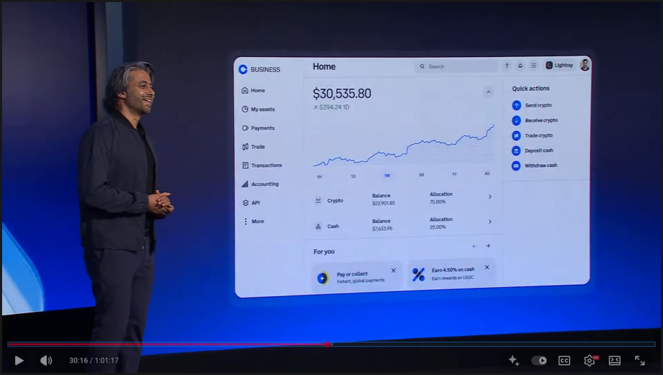 이후 코인베이스 비즈니스 총괄이 무대에 등장했는데요. B2B 서비스인 코인베이스 비즈니스(Coinbase Business)가 베타 단계를 마치고 정식으로 출시됐고, 이미 1,600개가 넘는 기업이 이 서비스를 사용하고 있으며 월간 기준으로도 두 자릿수 성장세를 보이고 있다는 점을 언급했습니다.