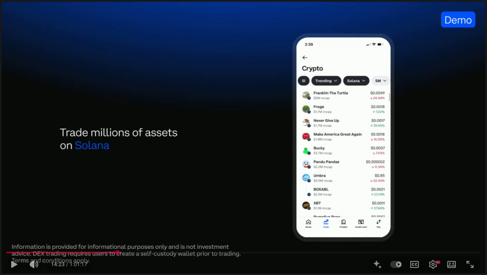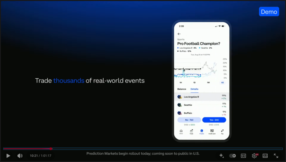 그 다음으로 코인베이스는 예측 시장을 소개했는데, 이 대목에서 현장 반응이 확 달라졌습니다. 발표가 나오자마자 관중석에서 환호가 터져 나왔는데, 그만큼 시장 참가자들이 기대하고 있던 기능이었다는 거죠.